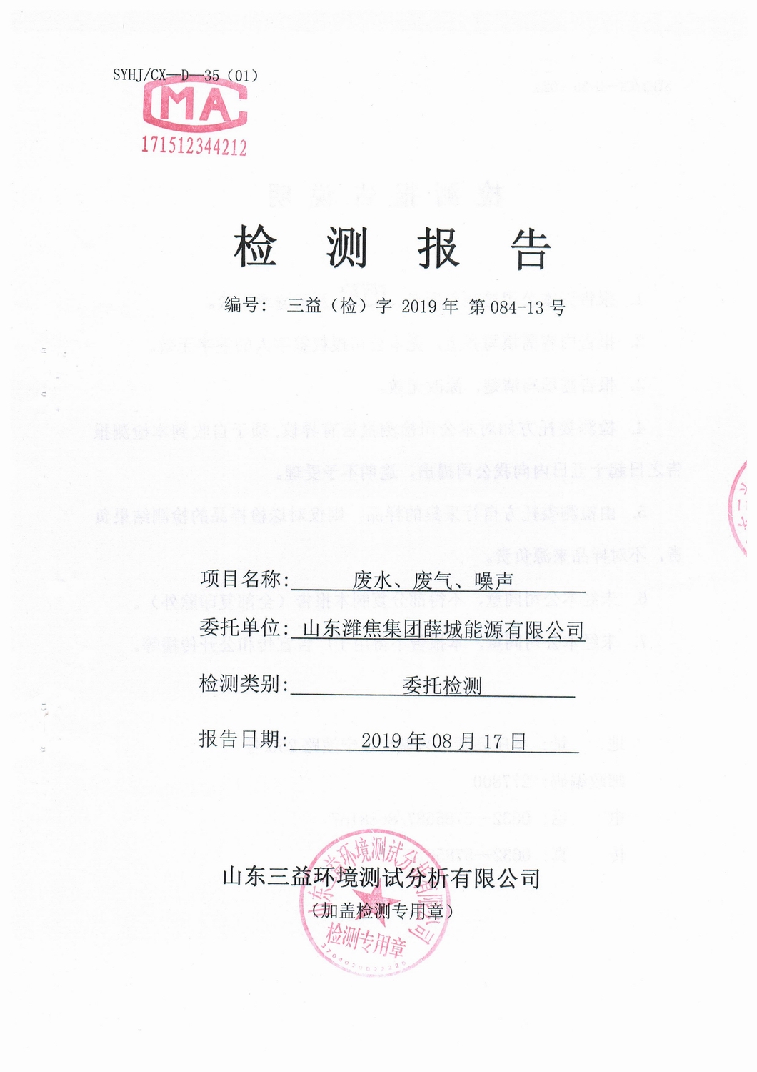 山東濰焦集團(tuán)薛城能源有限公司8月份檢測報告